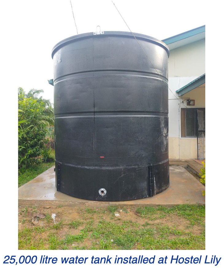 - Installation of rainwater tanks at Hostels Rose, Sunflower, and Lily to address frequent water shortages and ensure uninterrupted access to water